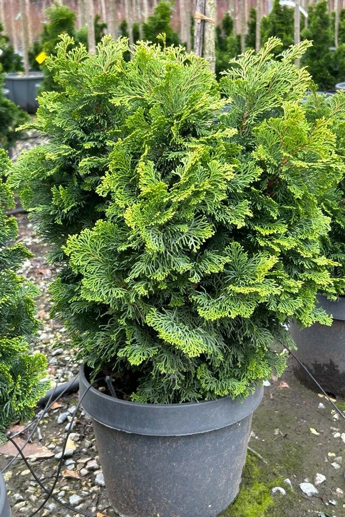 Description:Common name: Hinoke False Cypress. A shapely and distinctive conifer due to its unique dark green shell shaped sprays of foliage which appear to form waves and which develop into an uneven conical shaped conifer