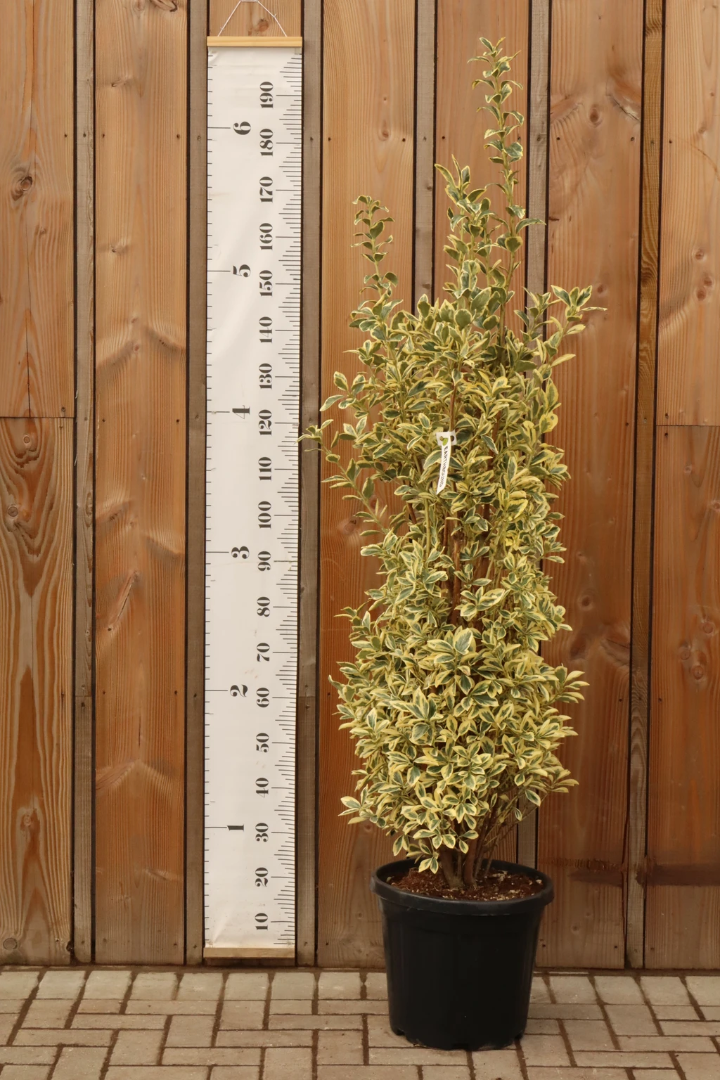 Description: Common name: Japanese Spindle. Evergreen shrub with large leaves, green in the middle with creamy margins. Some leaves will have grey green blotches where the two colours overlap