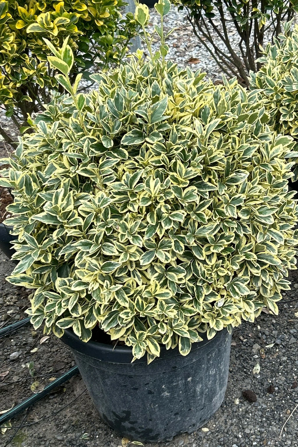 Description:Common name: Japanese Spindle. Evergreen shrub with large leaves, green in the middle with creamy margins. Some leaves will have grey green blotches where the two colours overlap