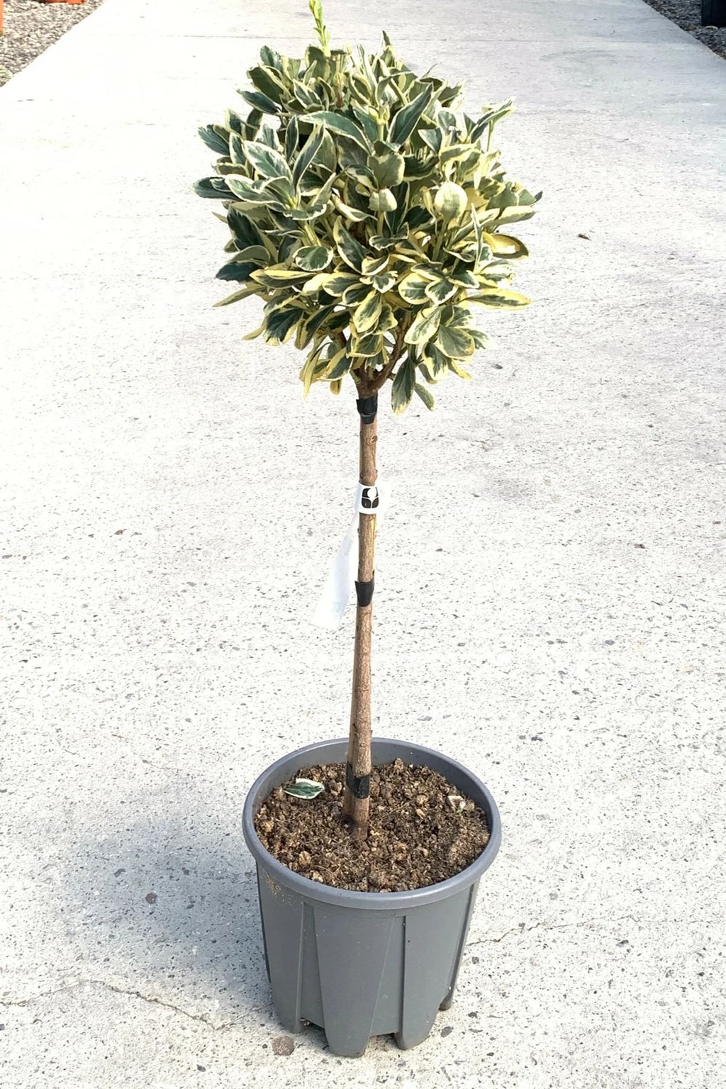 Description: Common name: Japanese Spindle. Evergreen shrub with large leaves, green in the middle with creamy margins. Some leaves will have grey green blotches where the two colours overlap