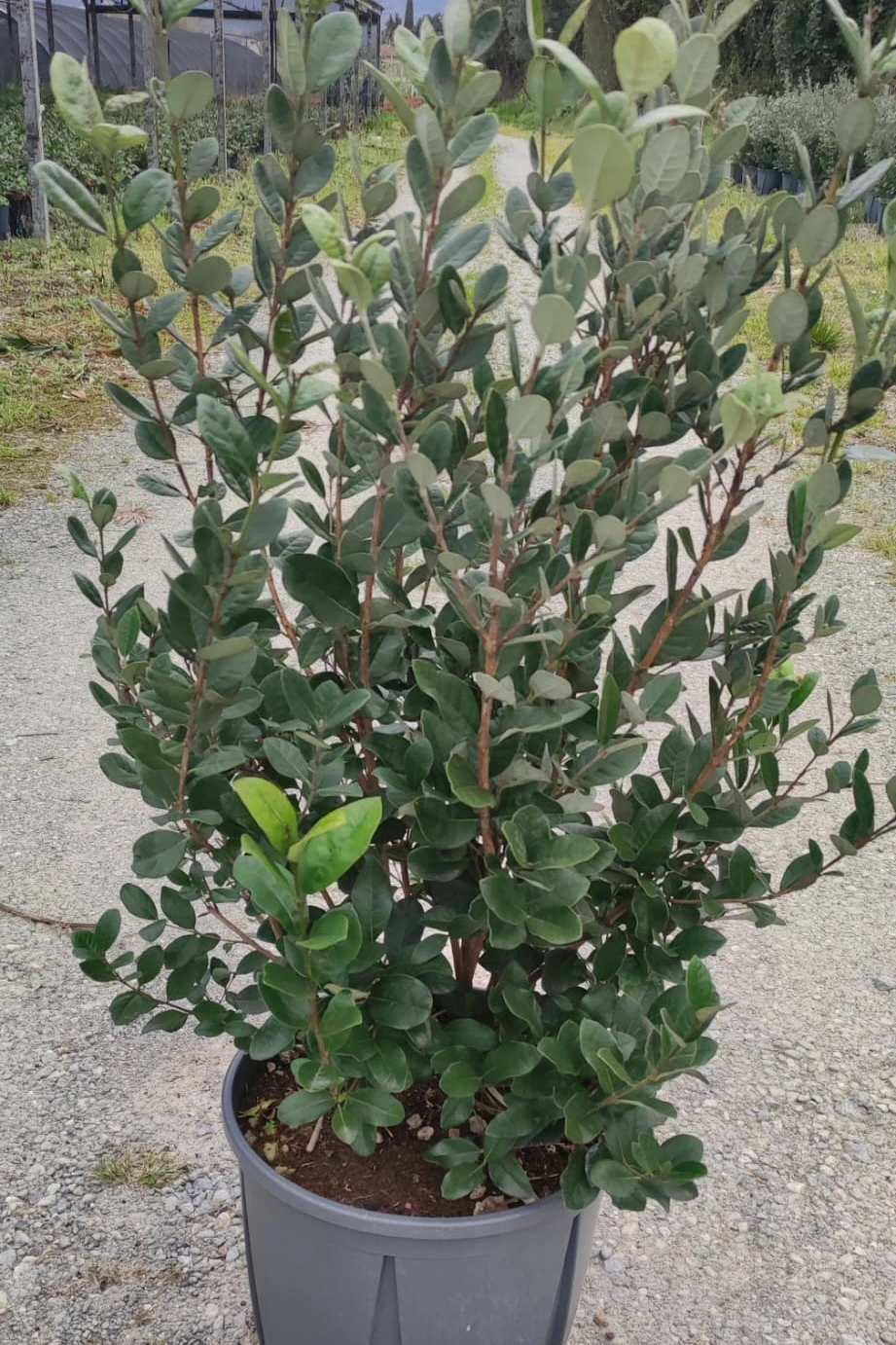 Description: Common name: Acca sellowiana, Pineapple Guava. A slow growing evergreen shrub with spoon shaped, grey- green leaves. Unusual flowers which look like a cross between aquilegia and fuchsia in shape are produce in late summer. The striking, slightly fleshy flowers consist of crimson, pink and white petals with prominent, star-burst like, crimson stamens. The flowers are followed by edible, guava flavoured fruits. This plant is a real talking point