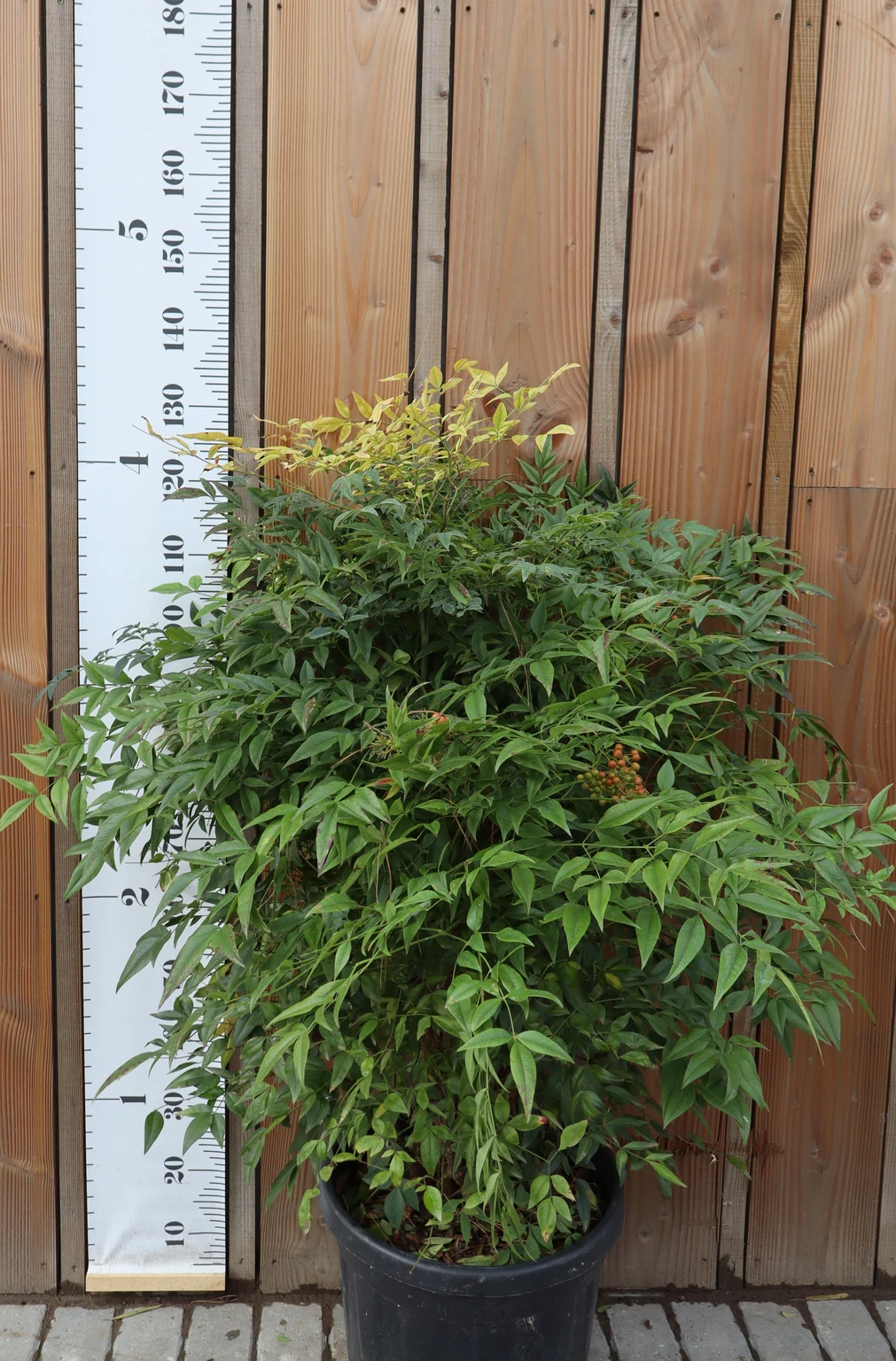 Description: Common name: Sacred Bamboo, Heavenly Bamboo. Grows to a small to medium evergreen shrub with upright habit and all year-round interest. In spring, the new leaves emerge pinky- red, the flowers in summer are large panicles of creamy-white and they are followed by green berries turning bright sealing-wax red which look wonderful in autumn together with the leaves which flush crimson