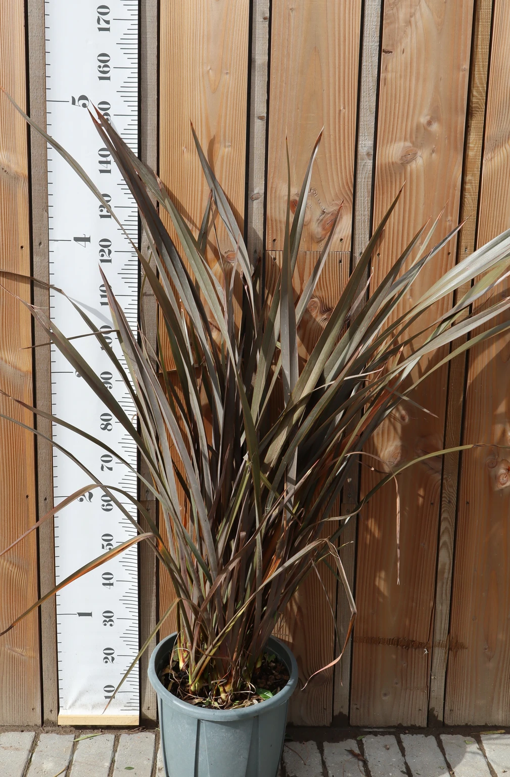 Description: Common name: Purple New Zealand Flax. Ideal specimen plant, rigid bronze-purple sword-like leaves. Tall erect growth