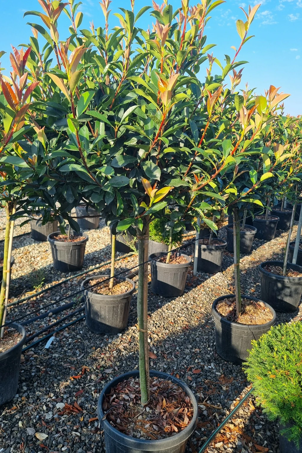 Description: A new selection of 'Red Robin' that is much more compact in habit with erect growth. The new growth is intense red in colour and ideal for Topiary