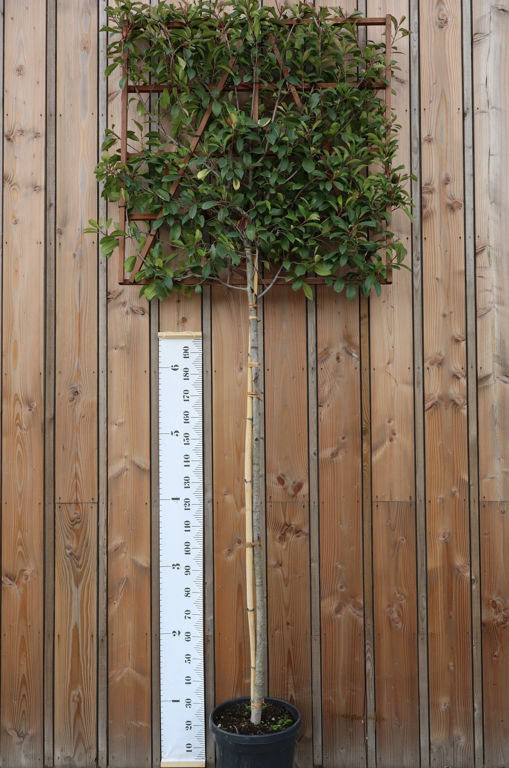 Pruning: Train new growth in to the framework, when there are no gaps in the frame then trim annually with topiary shears or hedge-cutters in early or late summer to keep specimen in shape. Suckers and unwanted branches can also be removed from the stems