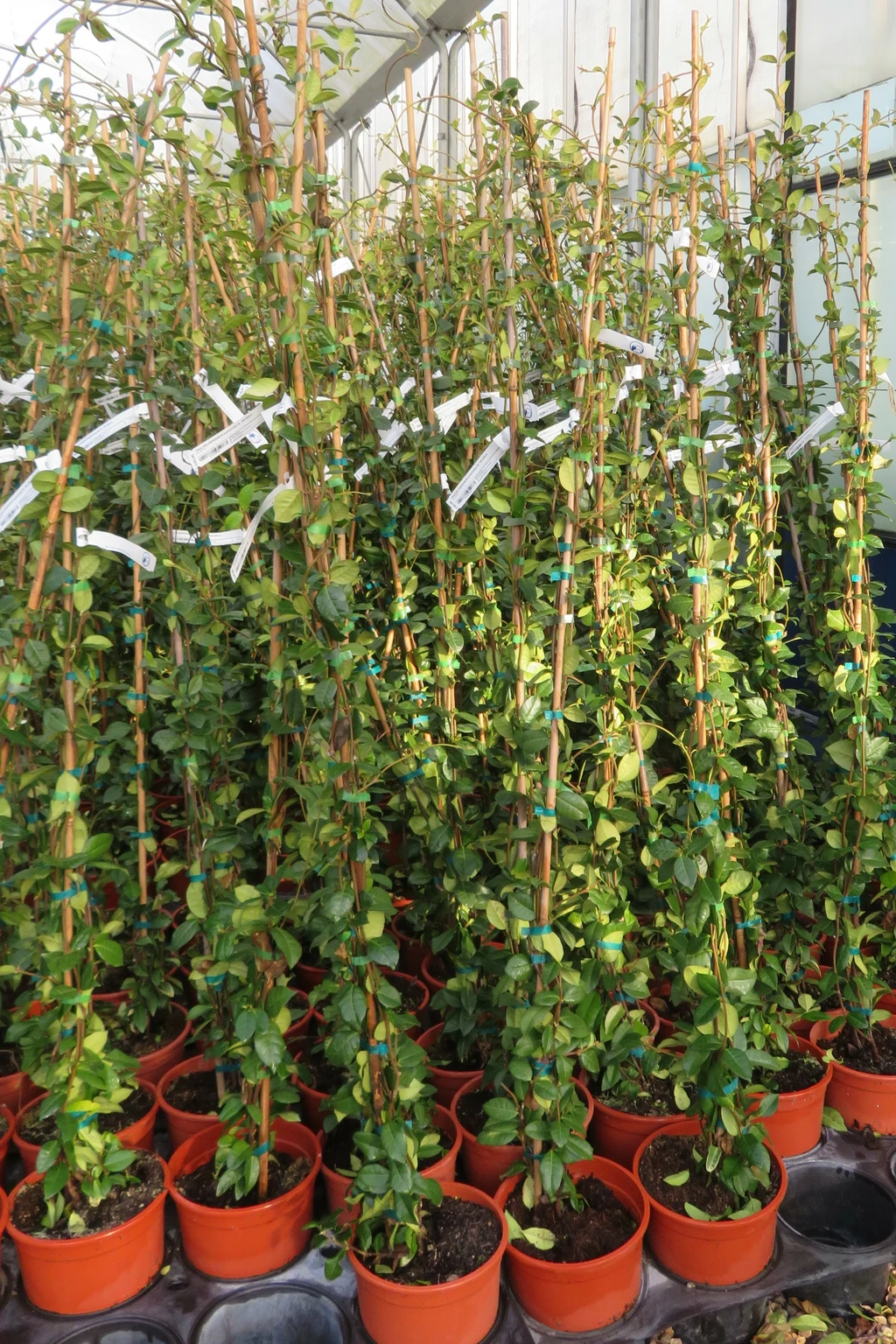 Description: An evergreen climber which has become very popular over recent years. Scented pure white jasmine like flowers which become cream with age, from mid- to late summer. The rich, dark green leaves make a wonderful background to the clusters of spiral-like flowers, the leaves also give additional interest as they turn a reddish colour in winter