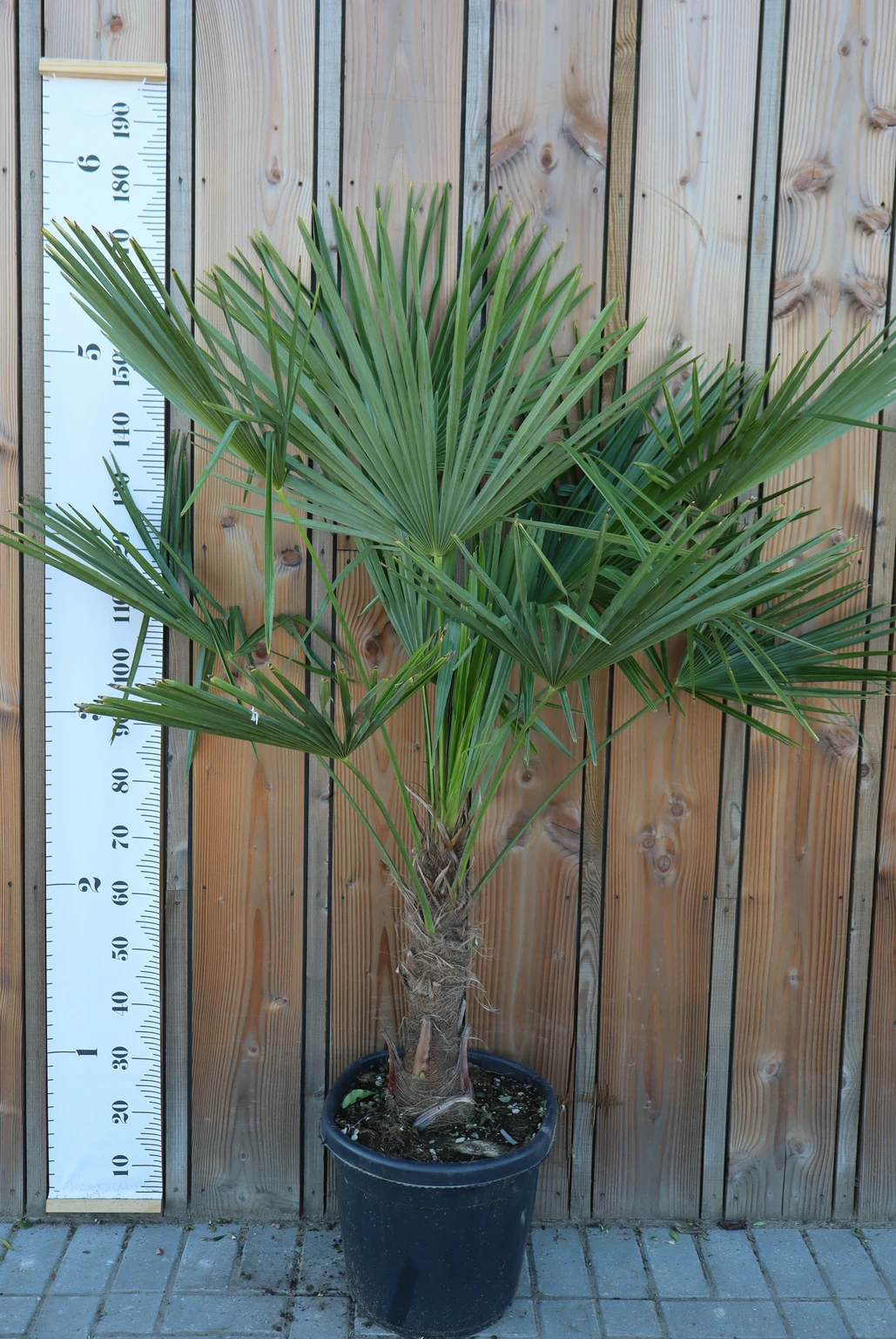 Description: A hardy palm which has been used to create an exotic feel in British gardens since its introduction over 150 years ago. The tall single trunk produces large fan shaped evergreen leaves which last for many years and eventually die from the base and form a taller trunk covered in fibre as new shoots form at the top of the plant. Mature plants may produce large drooping panicles of small flowers in summer